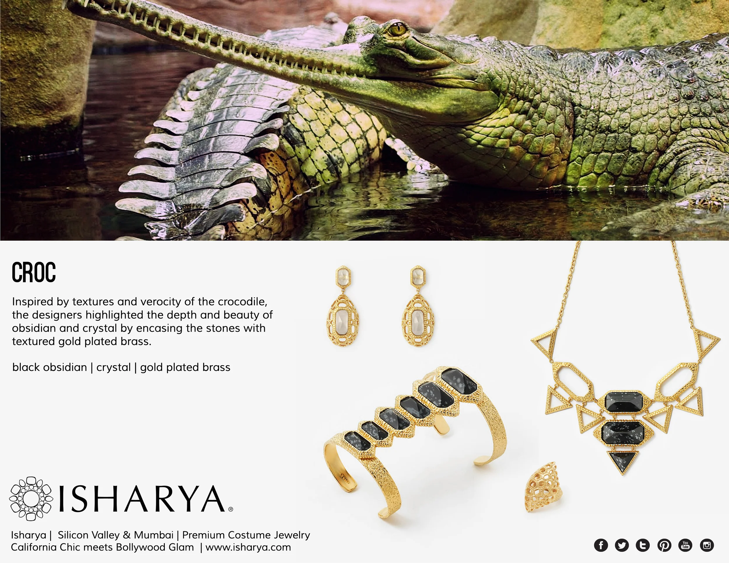 The fiery ferocity of the prehistoric crocodile and its icy, primordial stare as translated into a croc designer jewelry collection. Its name derives from the Greek "kroko deilos", referencing the signature scaly skin which inspired this fash-forward collection of animal-inspired jewelry and chic crystal jewelry.