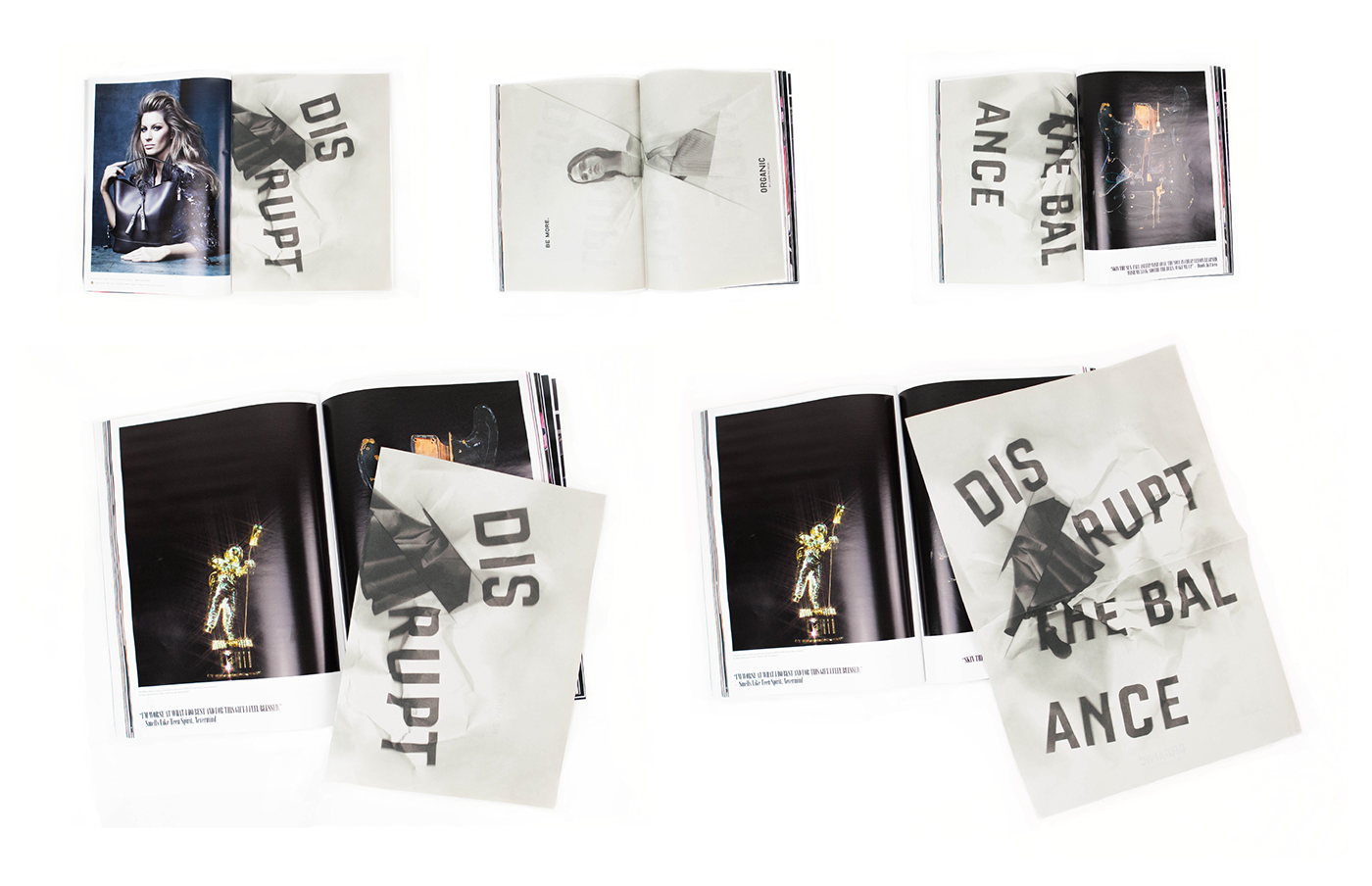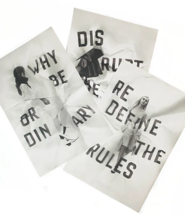 The phrases “Disrupt the Balance,” “Redefine the Rules,” and “Why Be Ordinary?” are bold statements illustrating this attitude and vision, which hint at the idea of a revolution to change standards and question society. On the back of each poster there is another girl joined by the simple phrase “Be more.” While the message is meant to be open ended, the underlying meaning is to expect more, want more, and demand more from life.