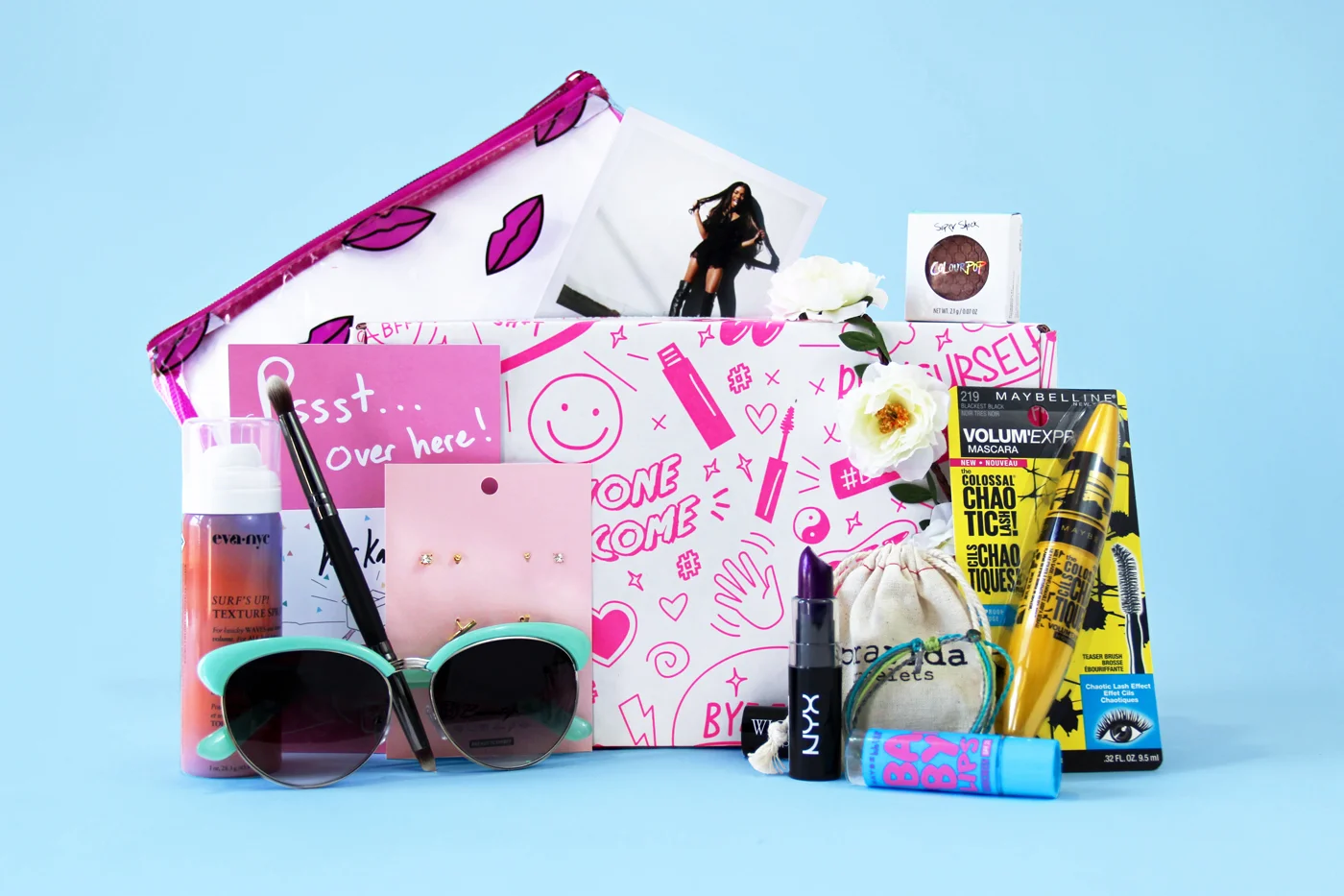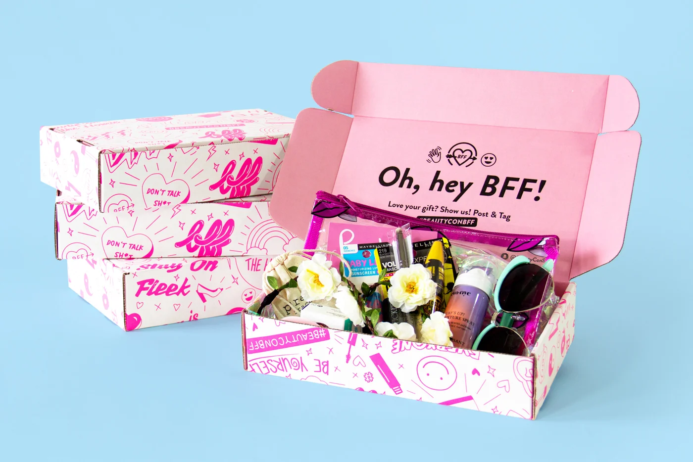Branding & packaging designed for Beautycon's seasonal beauty and fashion subscription box service aimed at girls aged 13-25 years old. Inspiration for the branding came from remembering those times in school when we would scribble on our best friend's binder or doodle in notebooks during class. Emojis and stickers with a hand drawn feel were designed for use throughout advertisements, displays, and other promotional materials.